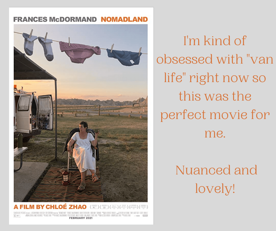 (Currently on Hulu) Share this: Click to share on X (Opens in new window) X Click to share on Facebook (Opens in new window) Facebook Like Loading... Related Nomadland March 11, 2021December 8, 2021 / Rowena Eureka / Leave a comment