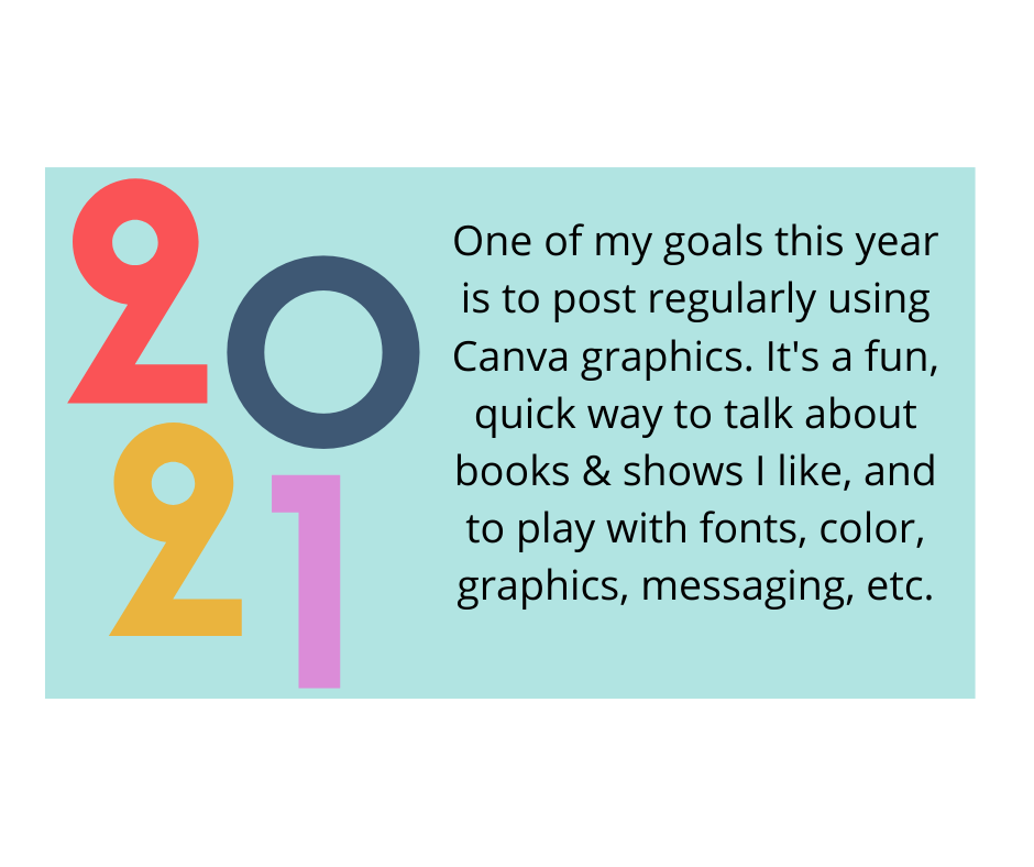 My health is still problematic enough that I can’t keep up a regular blog post schedule. I decided for 2021 I’m going to make Canva graphics for social media and post them to my blog, too. I enjoy playing around with Canva designs. I especially like them for highlighting books or shows I enjoyed. So it will be a fun 2021 experiment to blog solely in Canva graphics.